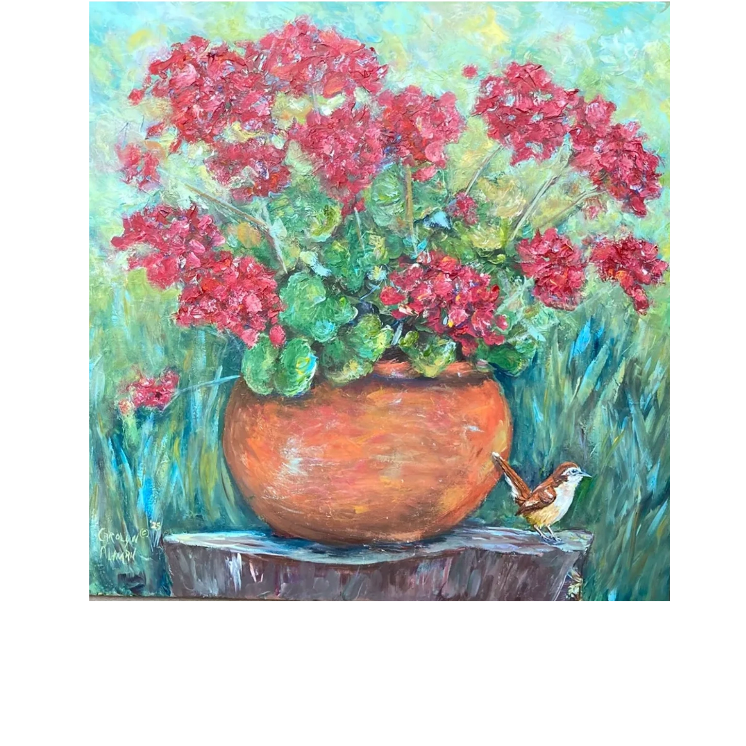 Little Wren perched by Red Geraniums in Terracotta Pot painting by Carolyn Altman 2025