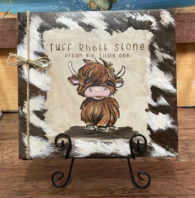 Baby nursery designs with a Dream Big Little Highland Cow theme for baby. Purchase a personalized baby memory keepsake book and soft velveteen blanket, note cards and invitations. Click for purchase options.
